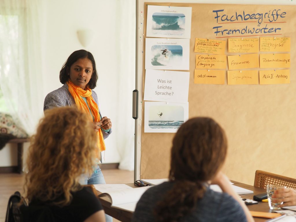 Briefe vom Amt, Vorträge voller Fachbegriffe, medizinische Befunde: Jede*r von uns hat Sprache schon einmal als Hürde erlebt. Für viele Menschen in unserer Gesellschaft ist sie ein beinah unüberwindbares Hindernis. So erlebte es Krishna-Sara, als sie vor einiger Zeit ehrenamtlich eine Frau mit körperlicher Beeinträchtigung und mit leichten Lern- schwierigkeiten beim Schreiben am PC unterstützte.